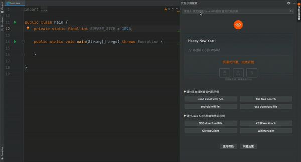 它主要提供2个功能,代码智能补全、代码示例搜索。 并且目前只支持Java语言,只支持IntelliJ IDEA插件